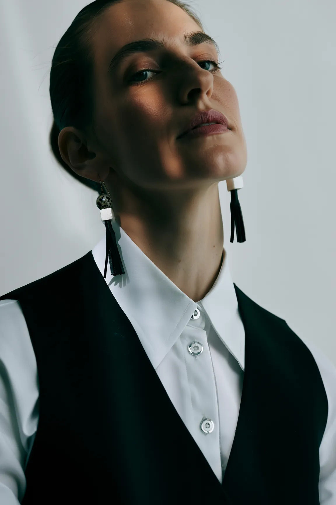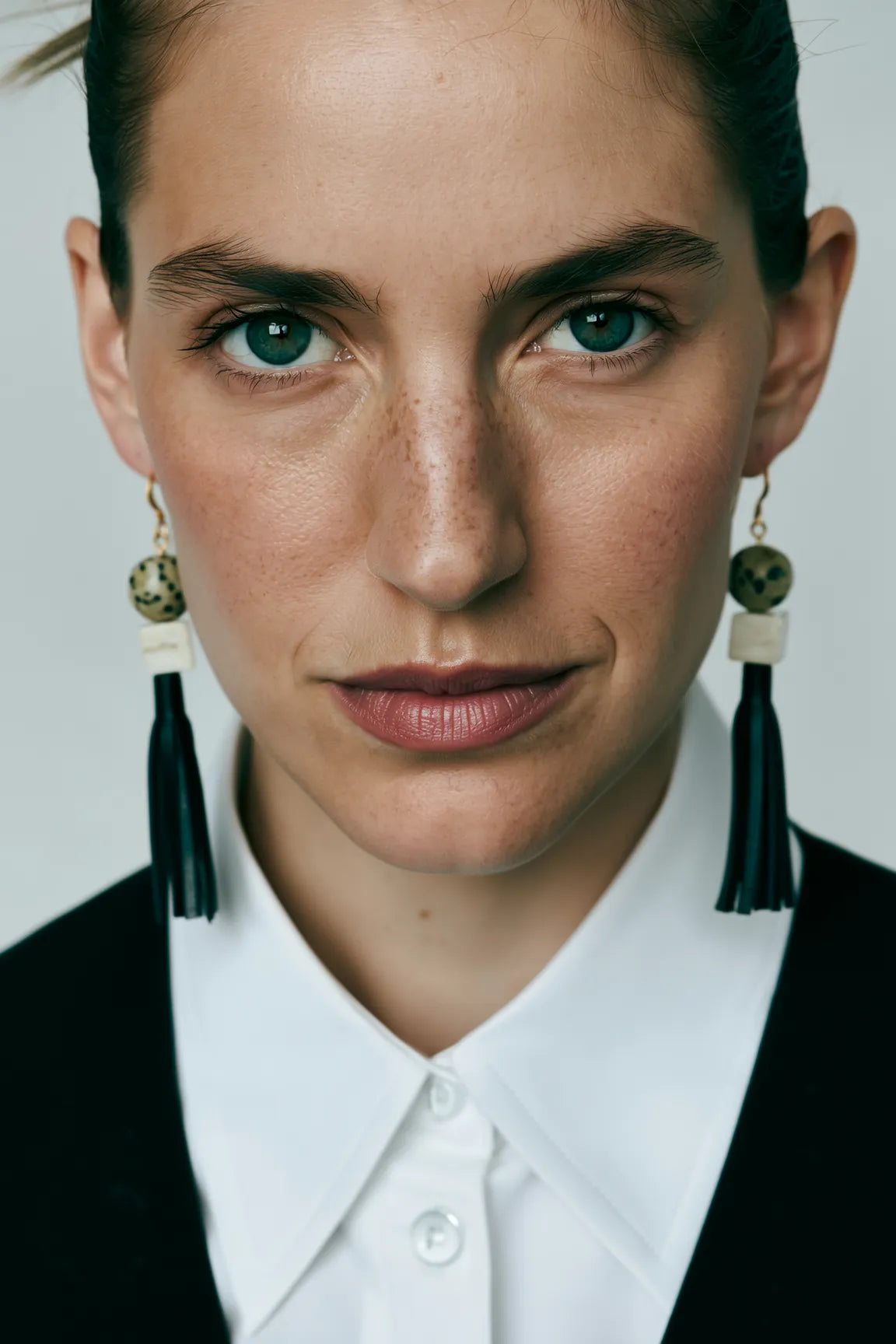 Diese Ohrringe vereinen Dalmatinerjaspis, einen klaren Korallenwürfel in Weiß und weich fallende Quasten aus schwarzem Lammnappa zu einem minimalistischen Statementstück.