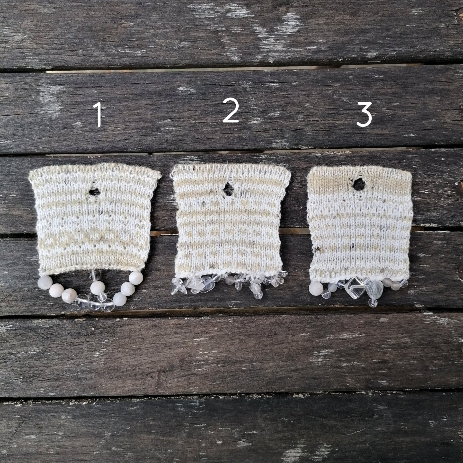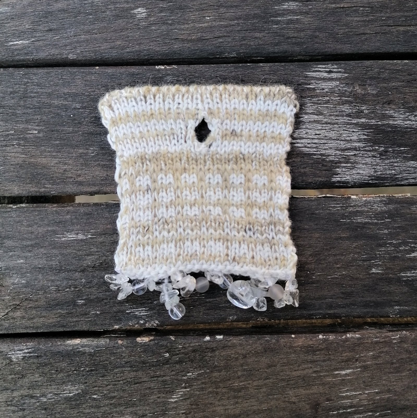 Entdecke eine neue Art, Deine Kleidung interessanter zu gestalten - mit diesem gestrickten Hemd-Accessoire, verziert mit Bergkristallen und Achaten. Kommt am besten am obersten Knopf des Hemdes zur Geltung. Gefertigt auf einer 100 Jahre alten Strickmaschine und handbestickt mit Edelsteinen. Ein einzigartiges und ansprechendes Detail, wenn du nicht auf 0815 stehst.