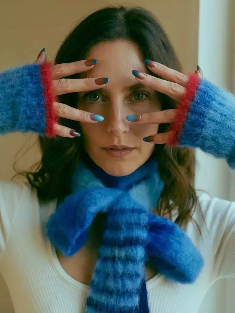 Diese luxuriösen, fingerlosen Handstulpen sind ein echtes Statement-Accessoire für die Hände. Das Design überzeugt durch einen fließenden blauen Farbverlauf (Ombré), der von kräftigem Rot gerahmt wird.