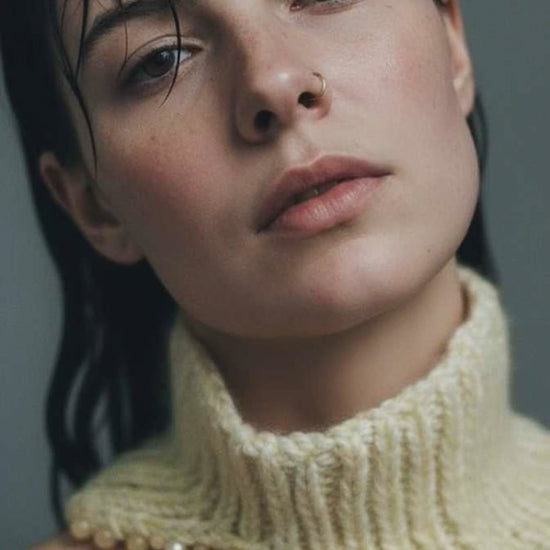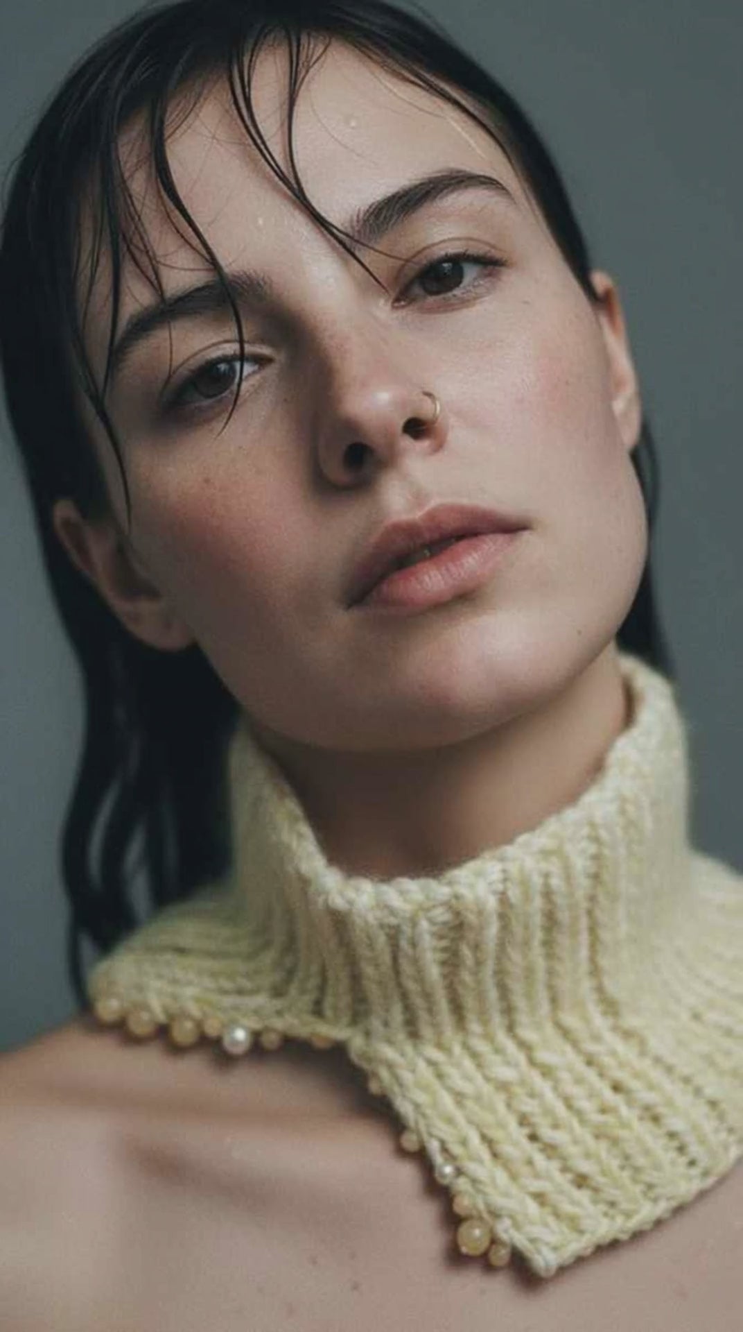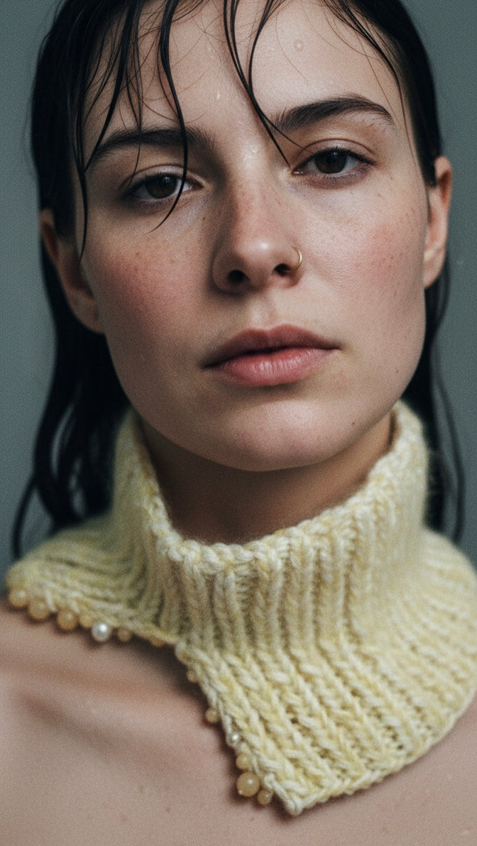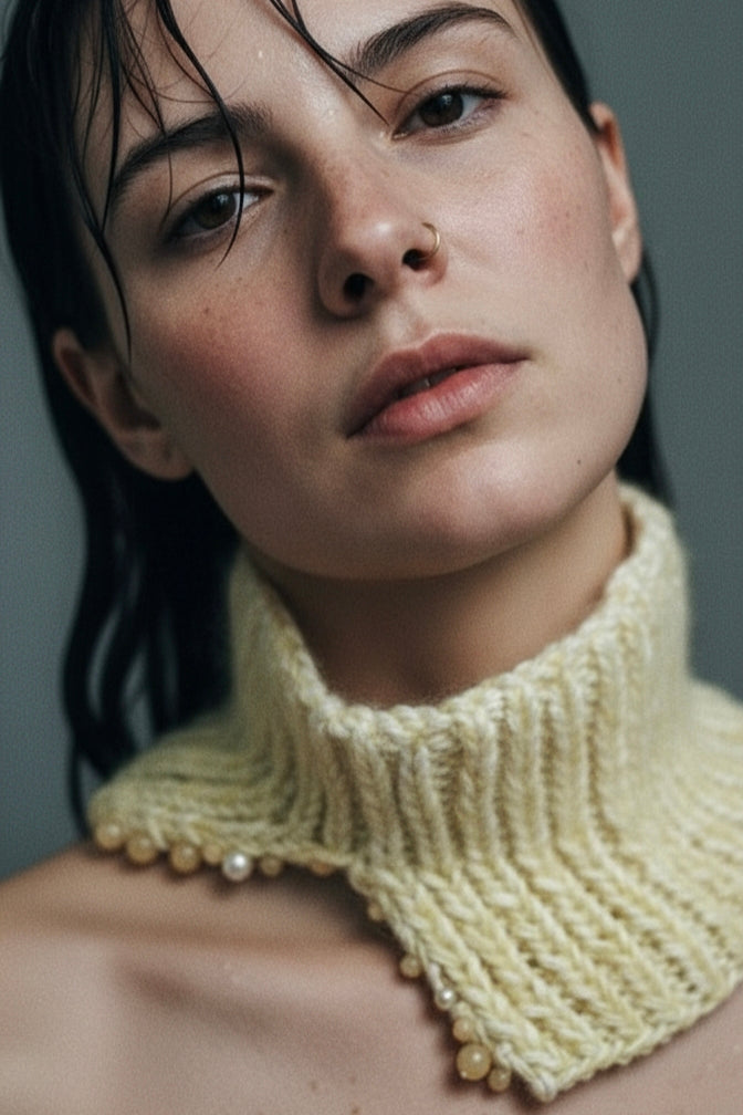 Dieser handgestrickte Kragen mit dicken, weichen Garnen aus Baumwolle, Mohair, Seide und Superkid Mohair ist ein wahres Einzelstück.
