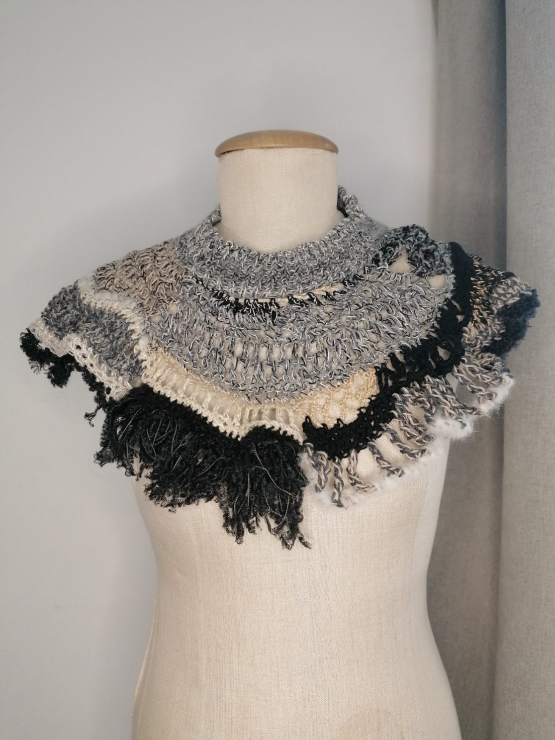 Mache dein Outfit mit diesem handgefertigten Neckpiece in Schwarz und Naturtönen zu einem originellen Style! Durch die Mischung aus verschiedenen Garnen wie Merinowolle, Schurwolle, Baumwolle (teils Bio), Mohair und Polyamid ist es nicht nur weich, sondern auch einzigartig in seiner Struktur.