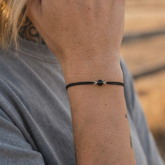Ein schlichtes Kordel Armband in schwarz mit 2 Onyx Perlen und Edelstahl in Silber.